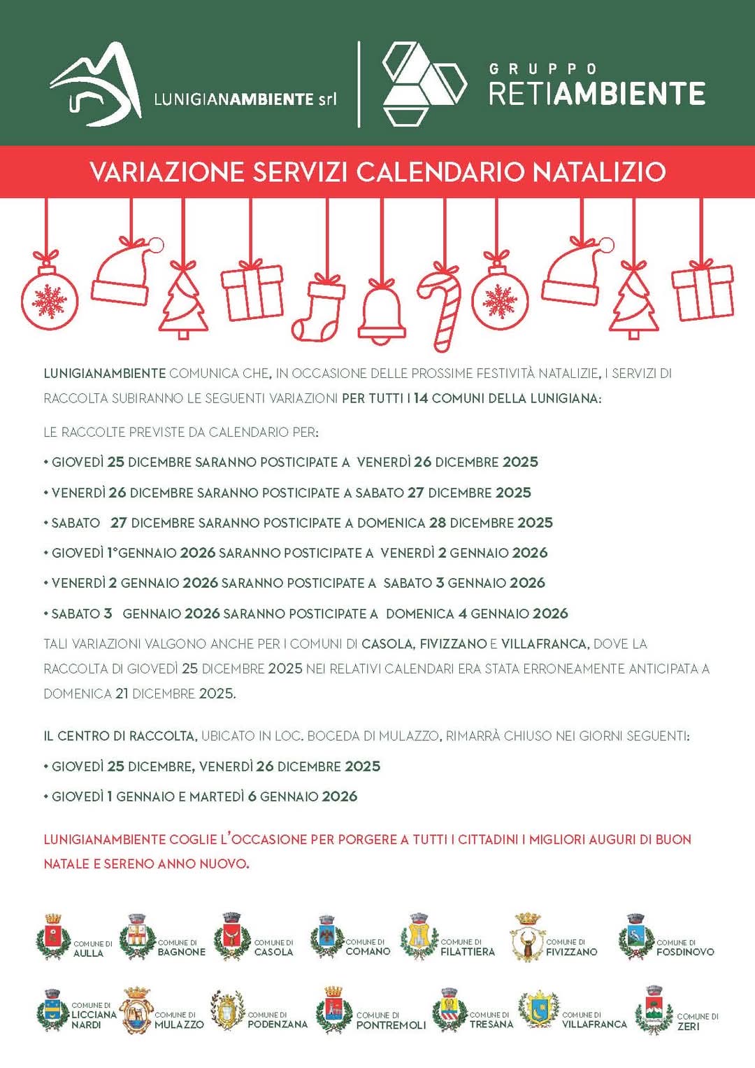 In occasione delle prossime Feste Natalizie il servizio di raccolta rifiuti subirà le variazioni indicate nell'avviso che si allega